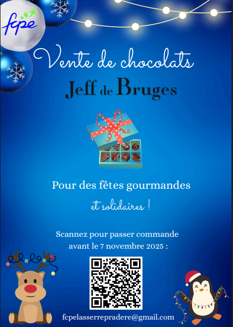 L’Association des Parents d’Élèves vous invite à partager un moment gourmand et solidaire en commandant vos chocolats pour les fêtes. Un geste qui compte : pour chaque achat jusqu’à 30 % seront reversés aux coopératives scolaires des écoles pour soutenir les projets de nos enfants (sorties, matériel, animations…)!