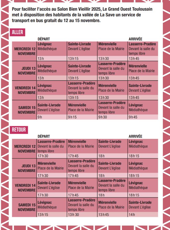 Pour faciliter l'accès au Salon Bien Vieillir 2025, le Grand Ouest Toulousain met à disposition des habitants de la vallée de la Save un service de transport en bus gratuit du 12 au 15 novembre |