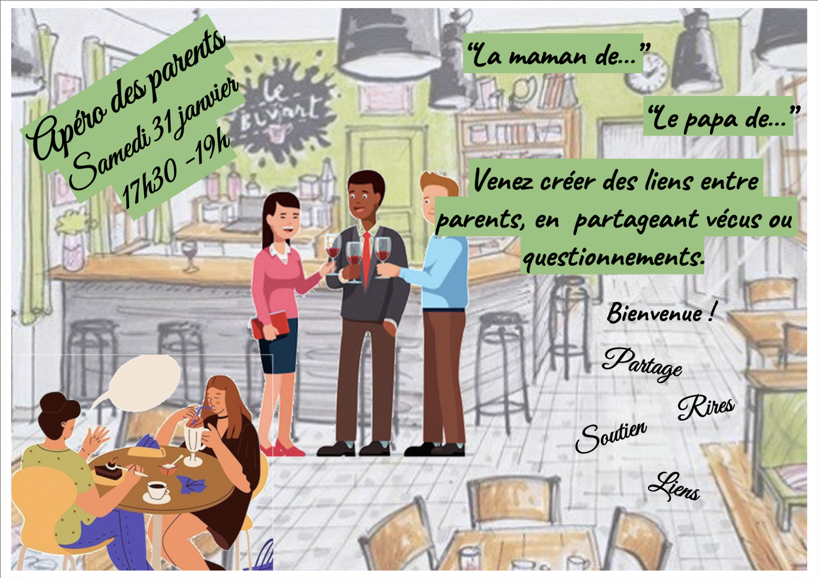 Il s’agit avant tout d’un moment de détente, d’échanges et de convivialité, ouvert à tous les adultes parents, dans un cadre bienveillant et informel.