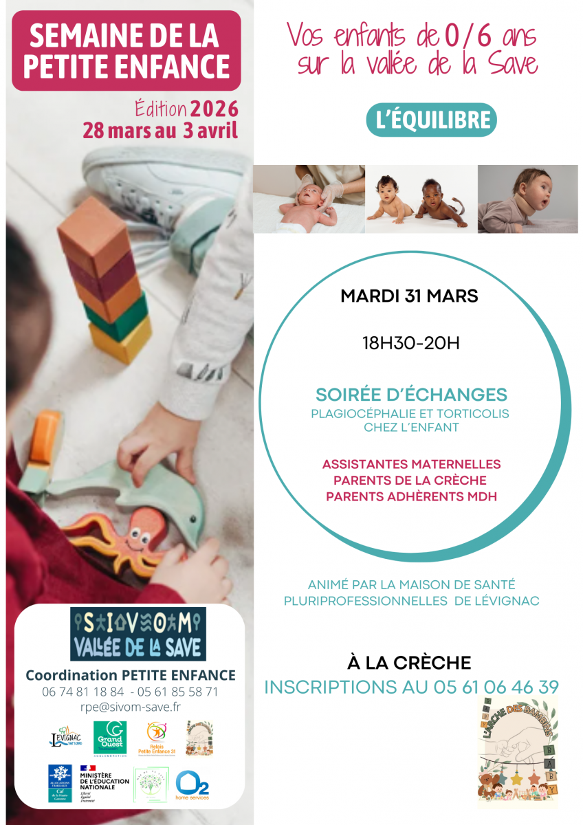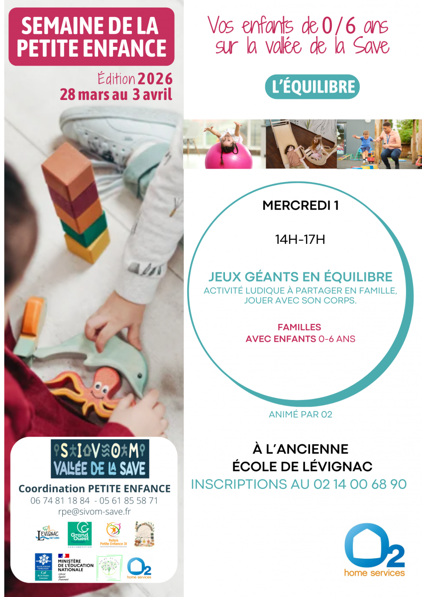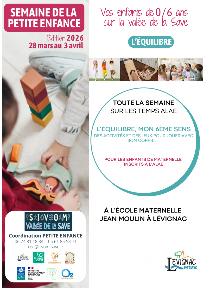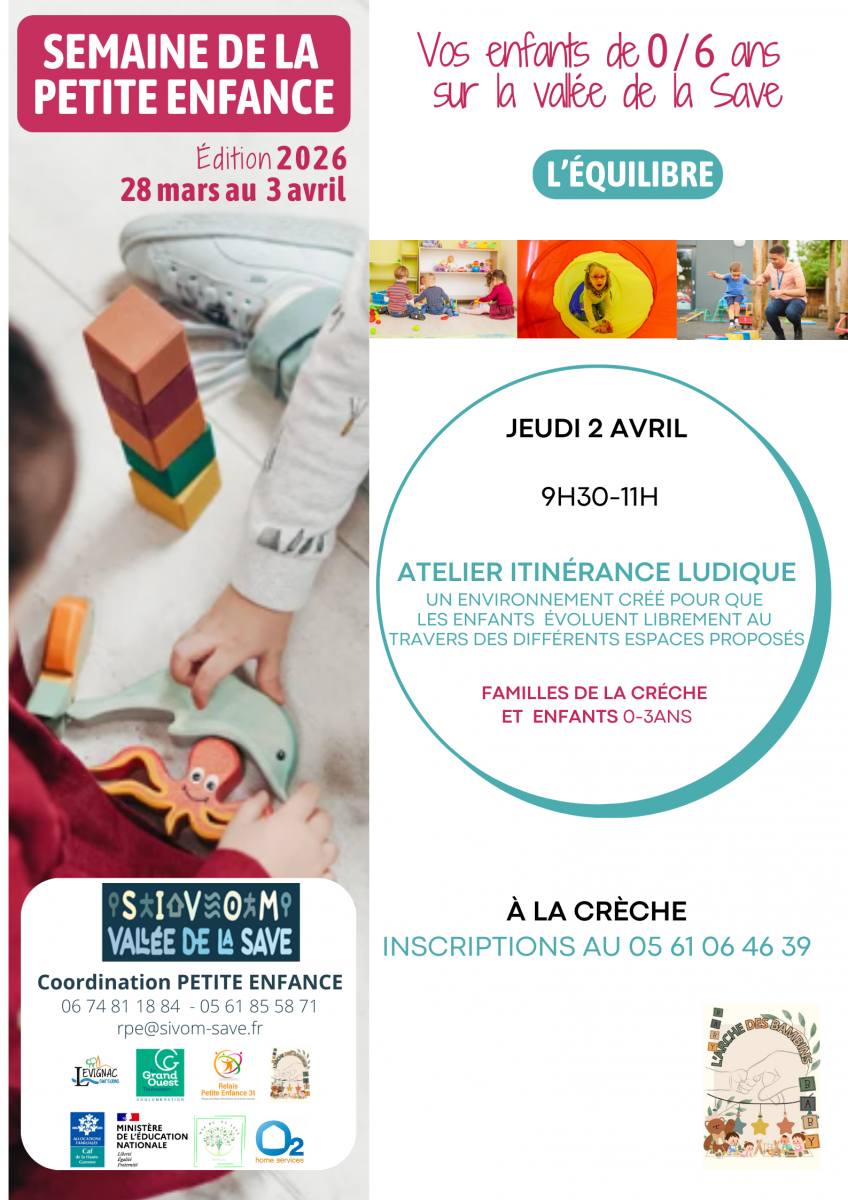 Le SIVOM de la Vallée de la Save vous informe de la mise en place d'un programme d'activités dédiées à la Petite Enfance (0 - 6 ans), du samedi 28 mars au vendredi 3 avril prochains.