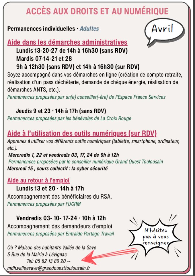 Ci-dessous la liste des permanences "ACCES AUX DROITS ET AU NUMERIQUE" pour Avril 2026 Maison des Habitants Lévignac