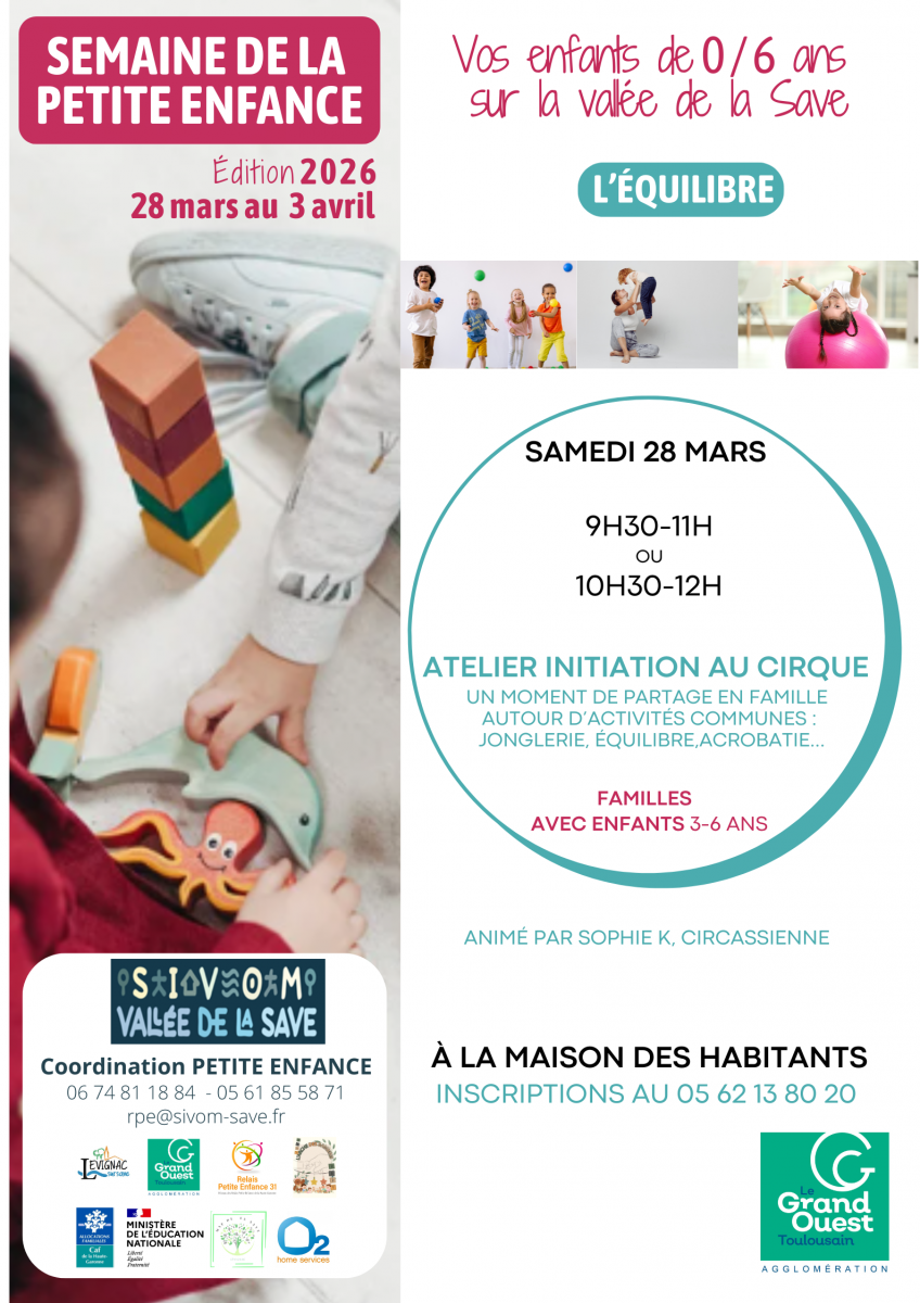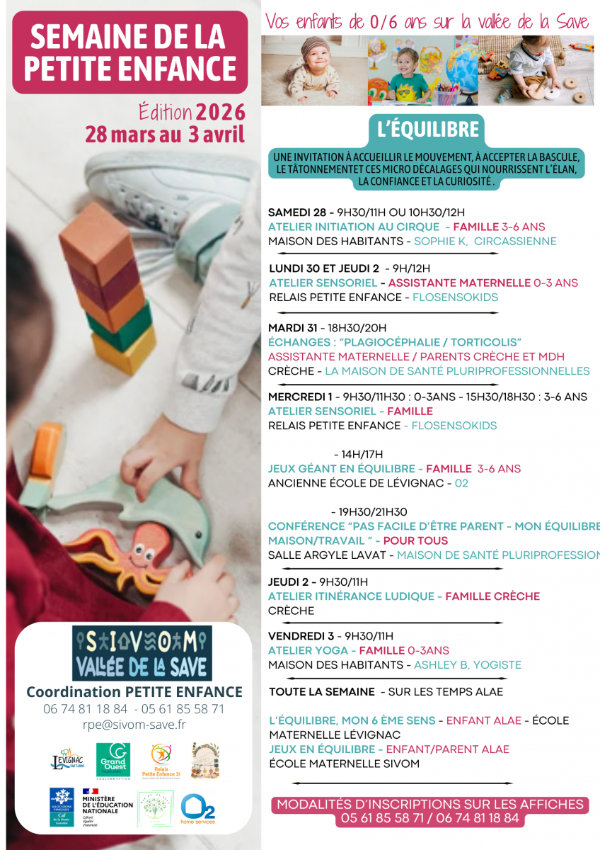 Le SIVOM de la Vallée de la Save vous informe de la mise en place d'un programme d'activités dédiées à la Petite Enfance (0 - 6 ans), du samedi 28 mars au vendredi 3 avril prochains.